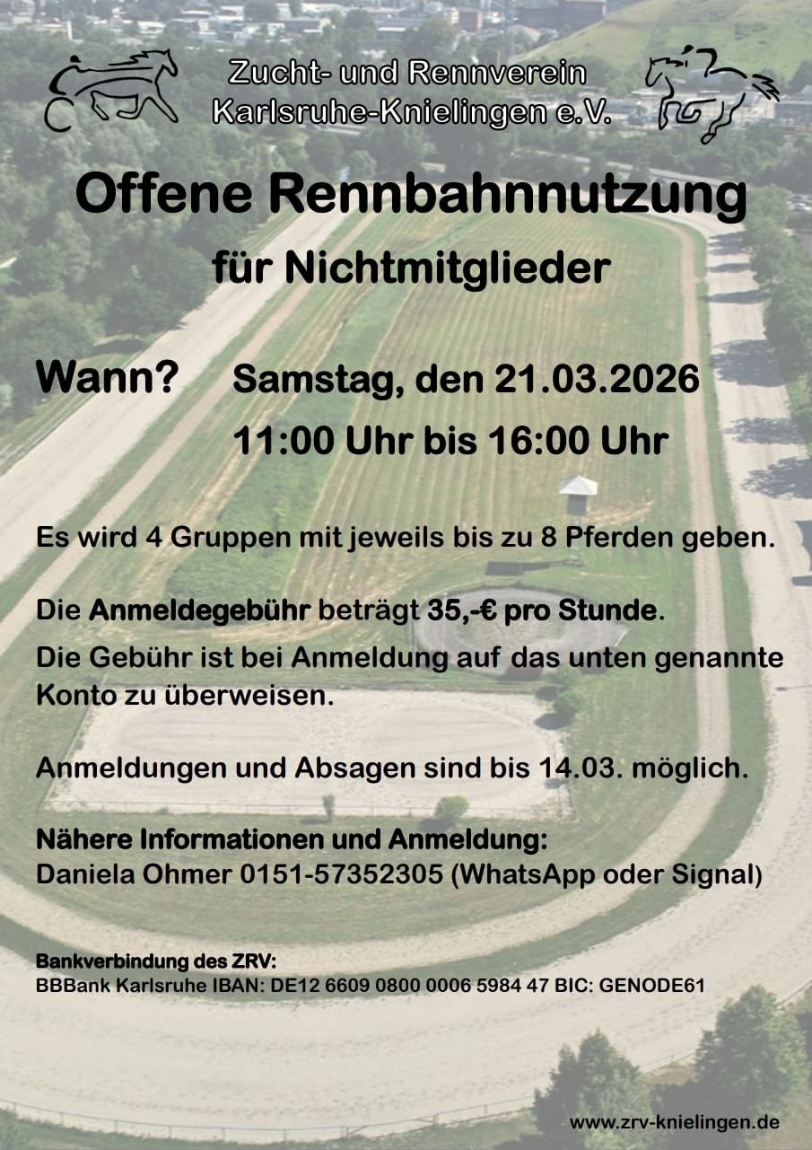 Am Sonntag, den 12. Mai, ist es soweit! Der Zucht- und Rennverein Karlsruhe-Knielingen lädt Sie herzlich zum Jubiläumsrenntag ein, anlässlich seines stolzen 100-jährigen Bestehens. Seien Sie dabei, wenn wir nach einer langen Pause wieder einen aufregenden Renntag veranstalten, voller Tradition, Spannung und Familienspaß.
